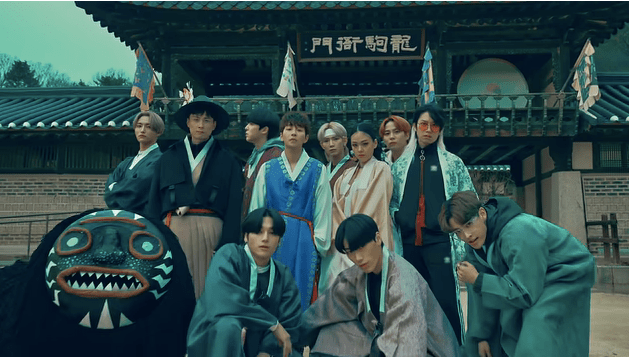 Musically and visually, it’s interesting because it uses some traditional Korean instruments and a traditional beat, and is filmed in a Korean folk village with traditional performers, so even if you’re not interested in the music, it’s worth watching just for that. And seeing half the crew with hanbok over hoodies and track suits is kind of fun – it’s as though Heechul at least is the naughty schoolboy he pretends to be on the variety show Knowing Bros.